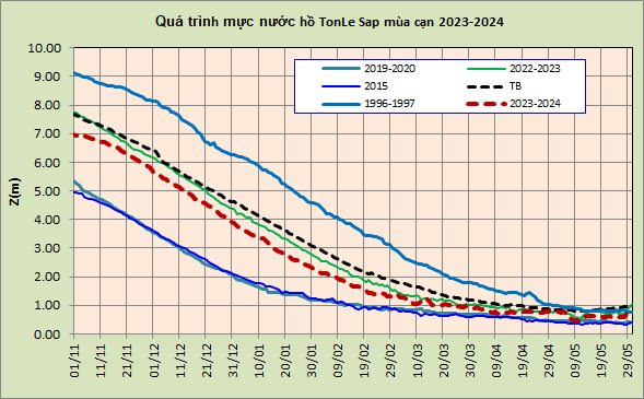 Hiện tại mực nước hồ Tonle Sap đo tại trạm Kompang Lương tính đến ngày 10/05/2024 giá trị mực nước trung bình đạt 0,5m, giá trị hiện tại thấp hơn mực nước trung bình hồ cùng thời điểm là 0,32m, so với một số năm kiệt điển hình thì cao hơn năm 2015 khoảng 0,15m và cao hơn năm 2019 khoảng 0,04m. Dung tích hồ hiện tại khoảng 0,5 tỷ m3 (bằng khoảng 80% so với trung bình nhiều năm cùng thời điểm).