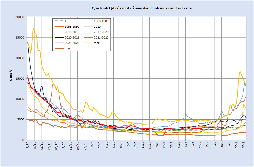 Về tổng lượng nước mùa cạn tính từ 01/11/2023 – 10/5/2024, tại Kratie tổng lượng nước đạt khoảng 72,39 tỷ m3, cao hơn trung bình nhiều năm thời kỳ đo đạc (1961-2024) khoảng 1,5 tỷ m3. So với một số năm cạn điển hình thì tổng lượng mùa cạn hiện tại: cao hơn mùa cạn năm 2019-2020 khoảng 27,57 tỷ m3 (cao hơn khoảng 62%), cao hơn năm 2015-2016 khoảng 16,95 tỷ m3 (cao hơn khoảng 31%), thấp hơn năm 2020-2021 khoảng 3,2 tỷ m3 (thấp hơn khoảng 4%).